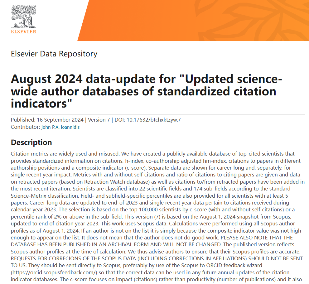 2024916日,美国斯坦福大学(Stanford UniversityJohn P.A.Ioannidis教授团队发布全球前2%顶尖科学家榜单(World's Top 2% Scientists)。榜单分为关注整个学术生涯迄今影响力的“终身科学影响力榜单”,以及聚焦本年度学术成就的“年度科学影响力榜单”。