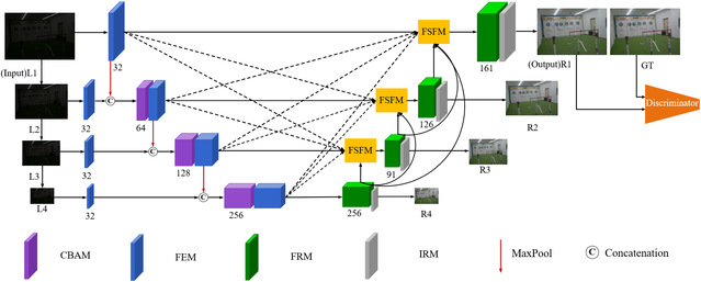 论文提出了一种基于多尺度特征互补的低光照图像增强网络(LIEN-MFC),这是一种由不同尺度的多个图像监督的U形编码器-解码器网络。在编码器中,构造了四个特征提取分支来提取不同尺度的微光图像的特征。在解码过程中,为了确保学习到的特征在每个尺度上的完整性,提出了一个特征补充融合模块(FSFM)来补充和集成编码器和解码器不同分支的特征。此外,在每个分支中构建了特征恢复模块(FRM)和图像重构模块(IRM),以重构恢复的特征并输出增强的图像。为了更好地训练网络,定义了一个联合损失函数,其中设计了一个判别损失项,以确保增强的结果更好地满足人眼的视觉效果。在大量数据集上的实验表明,所提出的方法在主观和客观上都优于一些最先进的图像增强方法。