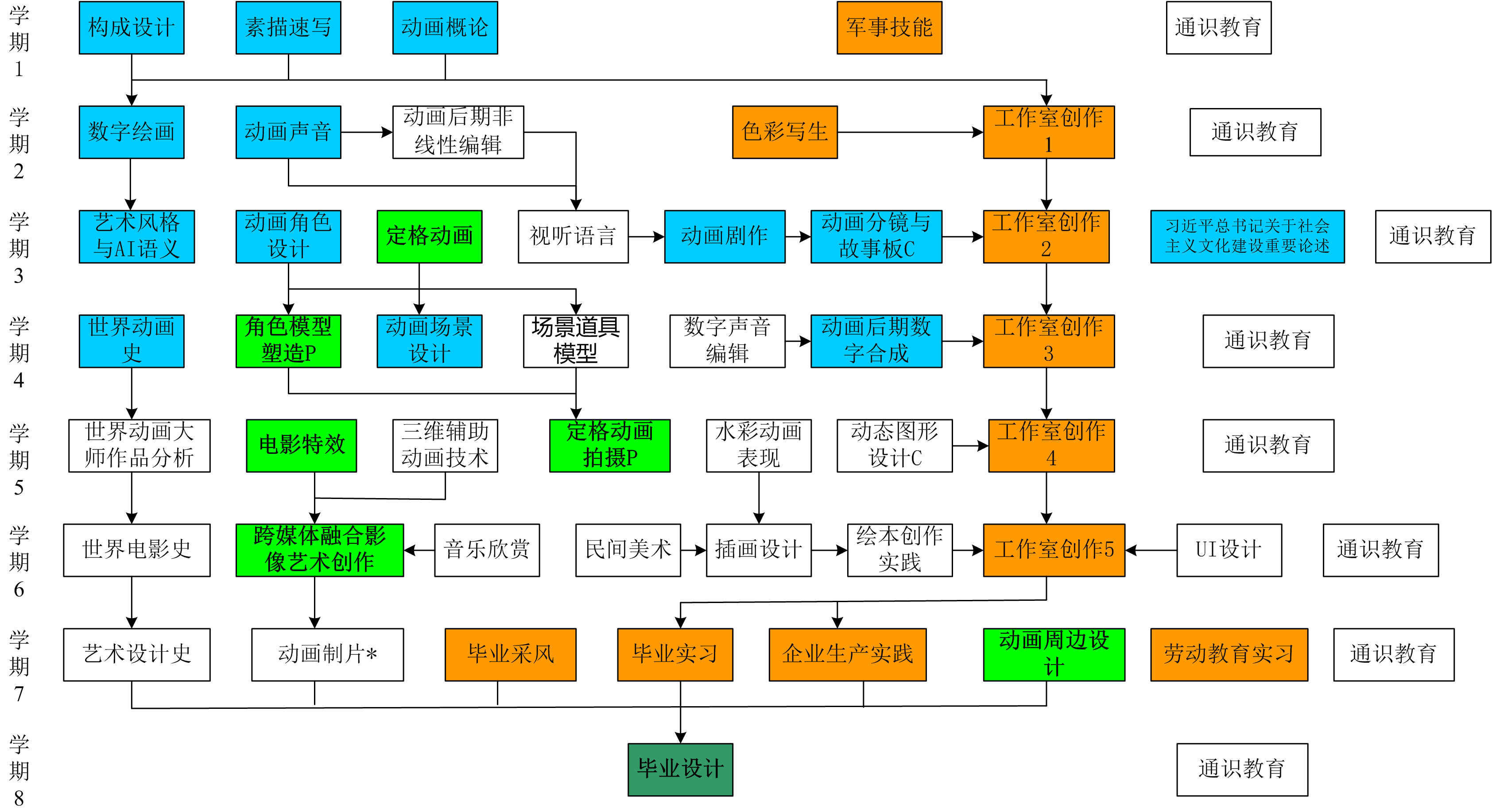 世界动画史、动画分镜与故事板、动画剧作、动画角色设计、动画场景设计、动画后期数字合成、定格动画、角色模型塑造、定格动画拍摄、电影特效、动画周边设计、场景道具模型、跨媒体融合影像艺术创作。