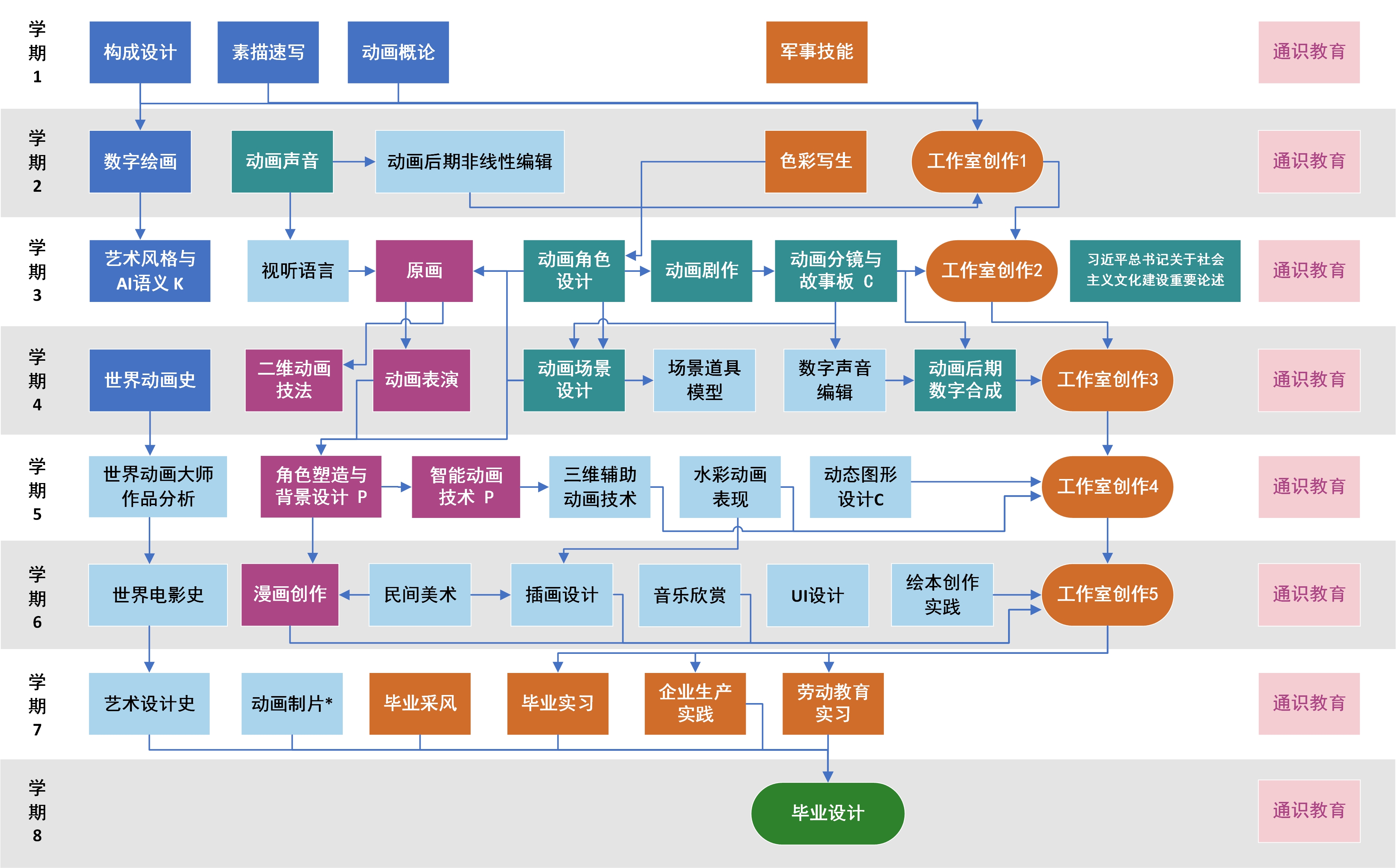 色彩写生、工作室创作(1-5)、毕业实习、毕业采风、毕业设计、企业生产实践。