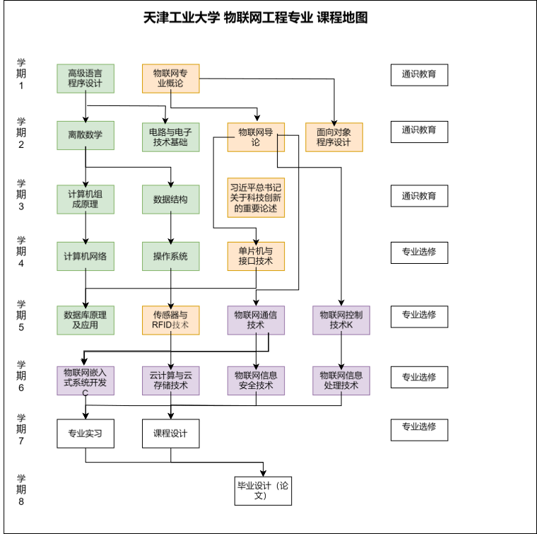 高级语言程序设计与实践(48学时+32学时)、离散数学(48学时)、数据结构(54+10学时)、操作系统(40学时+8学时)、单片机与接口技术(32学时+16学时)、计算机组成原理(56学时+8学时)、数据库原理及应用(32学时+16学时)、计算机网络(46学时+18学时)、物联网导论(24学时+8学时)、物联网通信技术(24学时+8学时)、物联网控制技术(28学时+4学时)、面向对象程序设计(30学时+18学时)、传感器与RFID技术(30学时+18学时)、物联网嵌入式应用开发(40学时+24学时)、物联网信息处理技术(34学时+14学时)、物联网信息安全技术(22学时+10学时)、云计算与云存储技术(26学时+22学时)。