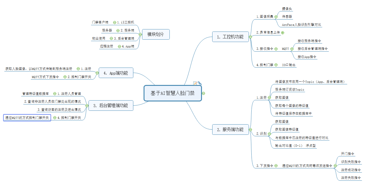 教 学 策 略 | 对系统进行模块划分,在组里指定员工分工完成工控机功能,服务端功能,后台管理功能,App端功能,并掌握虹软ArcFace SDK人脸识别引擎、利用RSA非对称加密算法、低功耗的嵌入式Linux开发板等开发技术。 对应的课前任务: 根据本组开发任务提前做好相关开发技术的准备工作,包括PyCharm、Qt、ArcFace SDK,Eclipse、IntelliJ,MySQL,Android Studio,TensorFlow等开发环境的搭建,开发语言和脚本的学习。 模块设计框图(如图1所示)