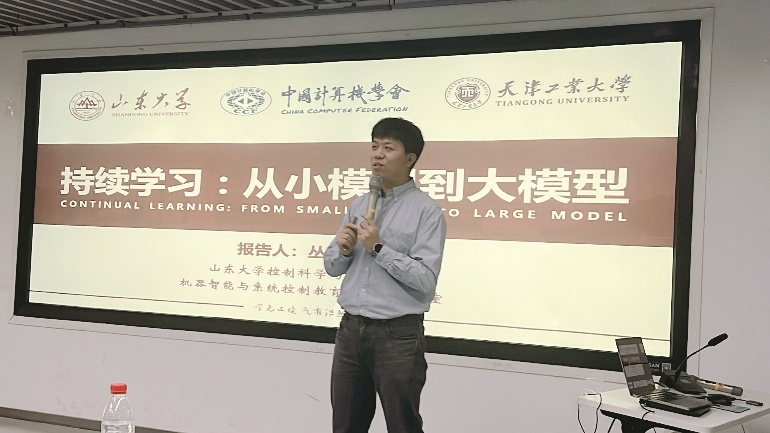 在学术报告环节,丛润民教授以“持续学习:从小模型到大模型”为题,指出持续学习旨在让智能系统在动态吸收新知的同时有效保留历史知识,是避免“灾难性遗忘”、趋近人类认知特性的关键。报告深入解析了经典小模型持续学习的理论框架,并重点展示了其团队在大模型时代下,针对持续学习范式面临的新挑战所取得的突破性研究成果。