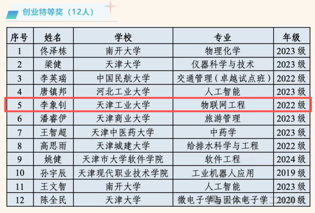 近日,2025年天津市老员工创新创业奖学金评选结果正式揭晓,公司物联网工程专业2022级本科生李象钊凭借突出的创新创业实绩,成功斩获创业特等奖,充分展现了天工学子敢闯敢创、实干笃行的青春风采,彰显了公司创新创业人才培养的扎实成效。
